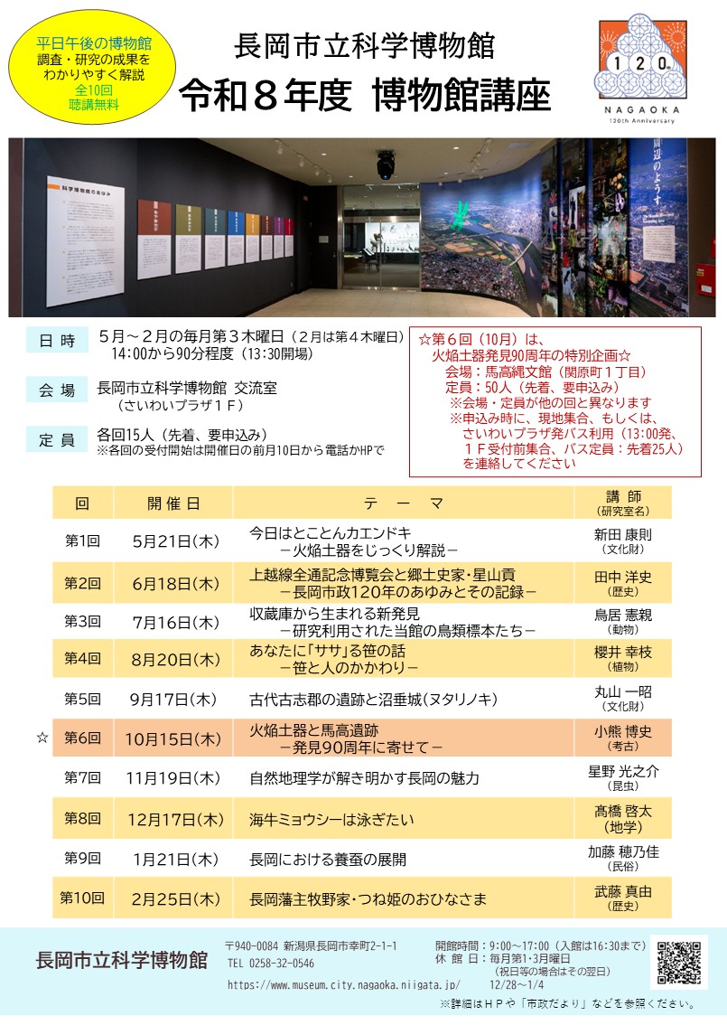 | 備考 | ・申込み期間 各回とも前月の10日~前日まで ・申込み方法 HP申込みフォームまたは科学博物館へ電話(Tel 0258-32-0546) |