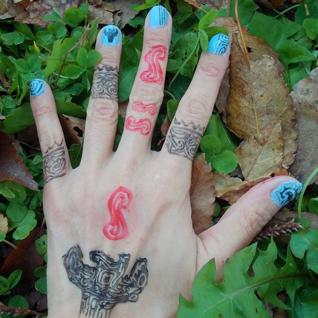 展示室にある火炎土器の文様や形を腕や手にスタンプ!