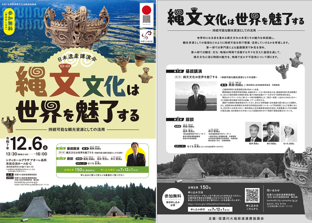 第一部では専門家による基調講演で知見を深め、第二部では観光・文化・地域の現場で活躍する方々を交えた鼎談を通して、縄文文化に宿る物語の魅力を、地域で生かす可能性について探ります。